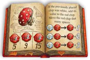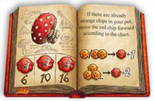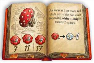 Bonus: If you draw a red chip from your bag, check if the last chip you placed in your pot was white. If so, you add the value of the white chip to the value of the red chip and move the red chip that many spaces forward in the pot. A red 1-chip drawn directly after a white 2-chip would therefore move 3 spaces.