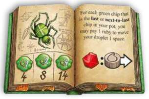Bonus: In Evaluation Phase B, you may pay 1 ruby for every green chip (irrespective of its value) that was drawn last or next to last and move your droplet 1 space forward. For example, if a green chip is on the next to last space, you may pay 1 ruby to move your droplet 1 space forward. You cannot pay more than 1 ruby per green chip (so a maximum of 2 rubies if both the last and next to last chips are green).