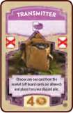 Choose any card on the market board or next to it. Put the new card on your discard pile, as usual. Remember to remove the Transmitter from the game after using it.