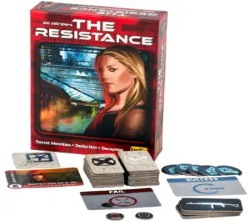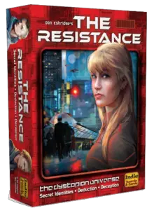 The Resistance is a social deduction game with secret identities. Players are either members of the resistance attempting to overthrow a malignant government, or spies trying to thwart the Resistance.