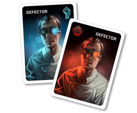 If the "Switch Allegiance" card is drawn, the two Defector players secretly switch their allegiances - The spy Defector is now resistance, and the resistance Defector is now a spy. This switch applies to all aspects of game play including victory conditions and rules regarding playing Mission cards. They do not swap or show their Character cards.