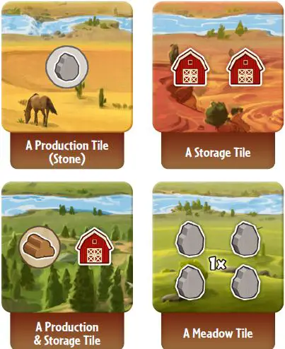 Tile effects will be explained in more detail later in the rules. For now , just note that some of them will produce resources (resource pictured in a circle) while others will allow you to store resources (warehouse symbol) and some will do both.