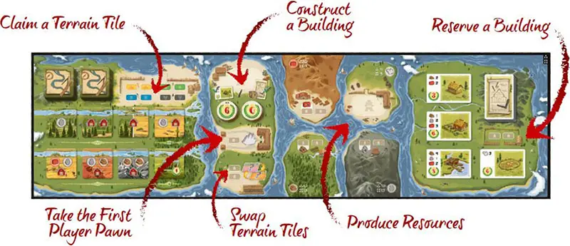 The game takes place over several rounds where players take turns (in clockwise order from the First Player) moving one of their Pioneers from their Boat to one of the islands on the Main Board, performing the associated action.
