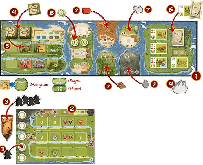 Place the Main Board 1 in the middle of the table, with the relevant side up (2-player game or 3/4-player game). Each player takes a matching set of components (River Board, Boat and Pioneers) and places their Boat and River Board with the relevant side up (2-player game or 3/4-player game) in front of them 2.