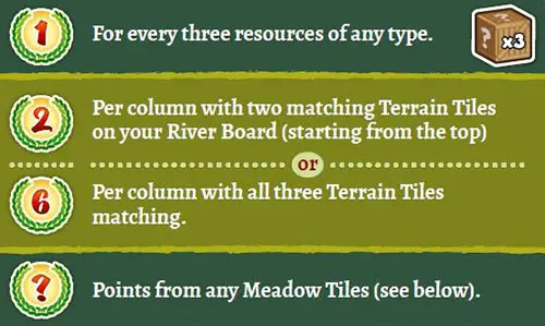 When someone has 5 Bonus Tokens on their River Board (4 in a 2-player game) or has claimed their 12th Terrain Tile, it triggers the end of the game. Complete this round, resolve one last Cleanup Phase, and then proceed to final Scoring.