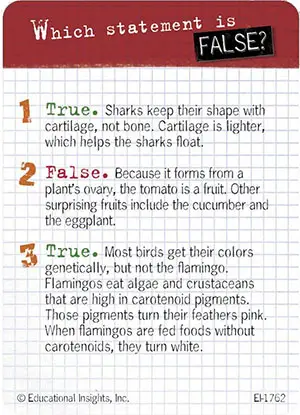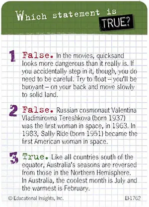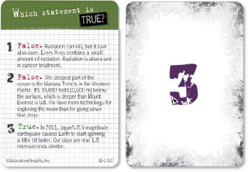 All players (including the reader) quietly choose the number they think is correct and place the corresponding answer card face down in front of them. When all players have an answer card on the table, Player 1 turns the card over and reads the answers aloud to reveal which is true or false and why.