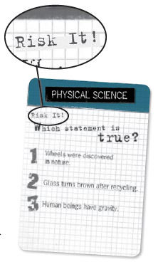 To take the risk, the player answers the card drawn. If correct, he or she draws a second card from any category and answers it as well. If both questions were answered correctly, the player earns a score chip from each of those categories.