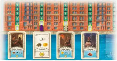 In this phase you determine the supply of trade cards that's available for the current round. For that purpose, take the top cards from the drawing pile (according to the number of players) and place them in a row face-up, from left to right on the water spaces of the Speicherstadt: