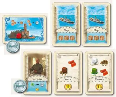 You're the head of a large trading house in Hamburg's warehouse district, the Speicherstadt. Using a bidding-and-buying system, you purchase trade cards.