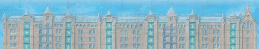 First, place the game board in the center of the playing area. It shows a part of Hamburg's warehouse district, the Speicherstadt, and includes water spaces and building spaces, as well as a score track.