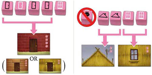 The last player to have seen pigs (or wolves) is designated first player of the game. Then everyone will take turns in a clockwise direction. When it is your turn, roll the dice, then use their results to build one or more houses.