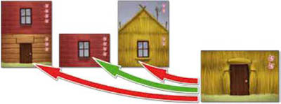 In this example, the door in straw must be placed under the middle house's window in brick. It can't be placed in the house on the right, because it already has a roof; nor can it be placed under the house on the left, because that one already has a door. The door in straw could also be used to start a new house.