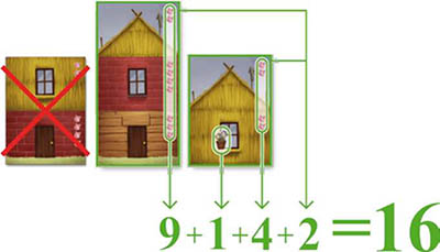 4 identical symbols (4 doors, 4 windows, or 4 roofs) allow you buy, respectively, a door, a window, or a roof of straw, wood, or brick.