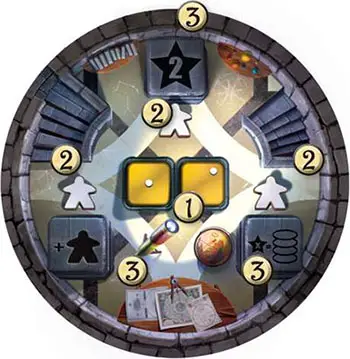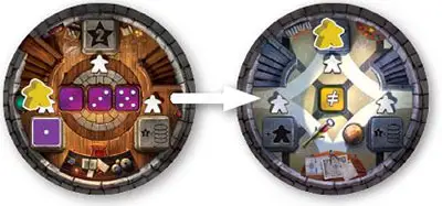 Place a Die and Meeple on a Pillar. Take any rolled die from the table and place it on an empty pillar of a floor tile. Then take a meeple from your supply and place it next to that die.