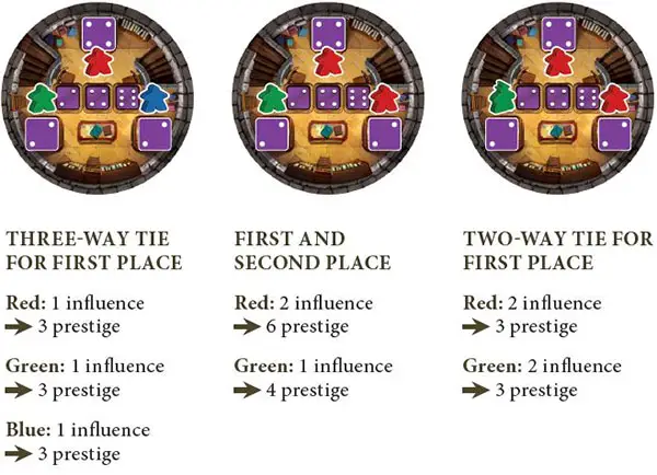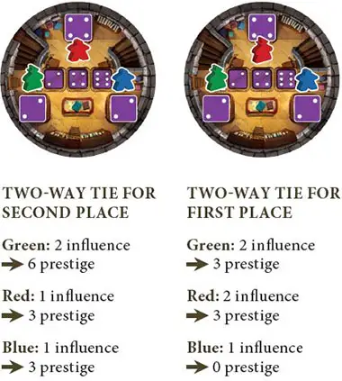If players tie for most or second-most influence, each tied player scores the prestige shown by the "tie" entry. However, if two players tie for most influence, the player with the second-most influence there does not score prestige.