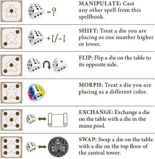 (Do not draw or place another die. This pillar is now full, bringing the floor closer to scoring. When this tile floor is scored later, this meeple will add to your influence, as normal).Your Spellbook: Place the meeple in your spellbook, on the spell matching the number of the die you placed to gain this bonus. (If the prompted spell already has a meeple, this bonus has no effect).