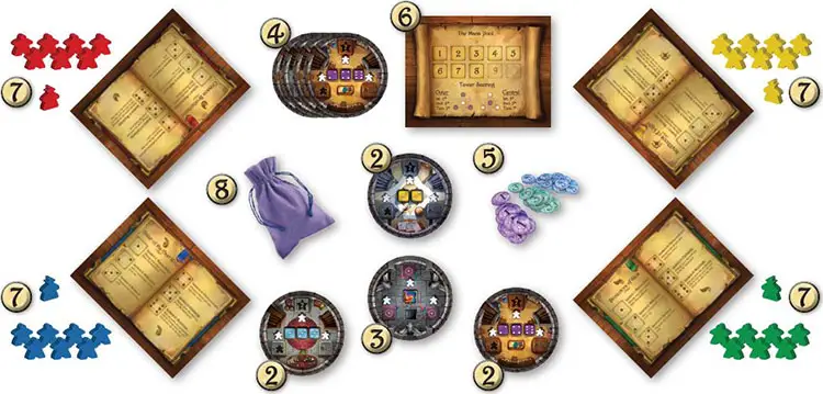 Players will score prestige by helping to construct the four wizard towers and by having the most apprentices and masters on each tower floor.