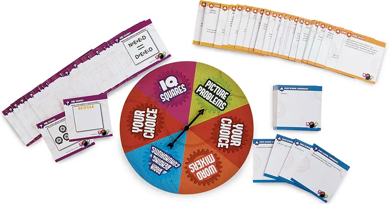 Remove the cards from their card boxes, and place the cards in four piles in the center of the table with the question side facing up. For the IQ Squares cards, it doesn't matter which side is facing up.