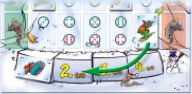 The player earns eight points (2 x 4) for his own snowboarder and seven points (1+3+3) for the three opponents' snowboarders. The crocodile player ends the game with 15 points.