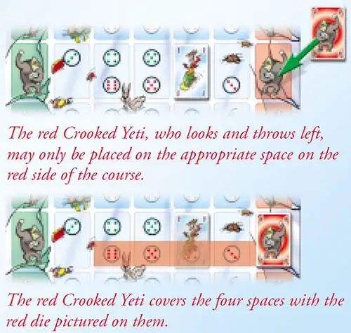 There are five different Yetis. Each Yeti stands at the edge of the course and watches over a row. A Yeti watches and throws snowballs either to the right (green cards) or to the left (red cards). Thus, each Yeti has an assigned space on the red or green side of the course.