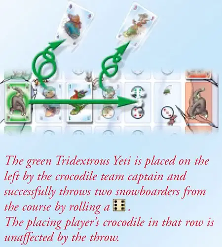 A player, who does not want to (or cannot) start or move a snowboarder, must place a Yeti. The player places a Yeti card from his hand on the appropriate Yeti space on the board.