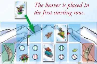 The player takes one of the face-up snowboarders in his play area and places it on the empty space of his choice in the first two rows of the course (starting rows). An empty space is a space where no other snowboarder stands.