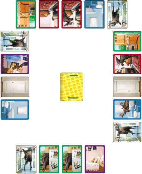 The first time you play, look through the deck to get familiar with the cards. Note that each Empty Room card has a matching color-coded Moose in the Room card.