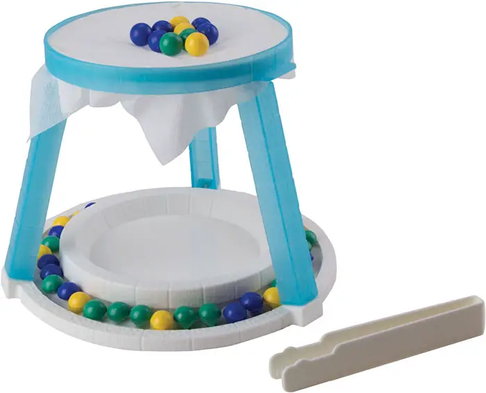 Place the tweezers over any marble in the channel and pick it up by gently squeezing the tweezers together. Now place your marble on the top of the tissue and quickly pass the tweezers to any player so he can place a marble on the tissue.