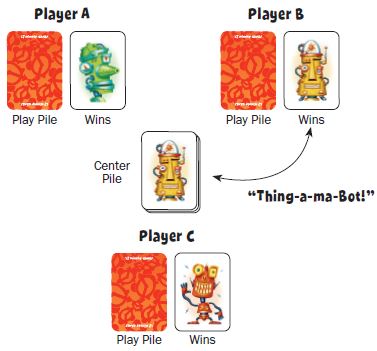 Any time the top center pile card matches the top card of any player's Wins pile, the first player to notice and shout, "Thing-a-ma-Bot!" steals that player's entire Wins pile. (Add cards to the bottom of any existing Wins pile).