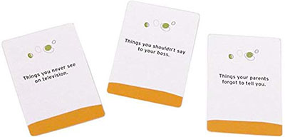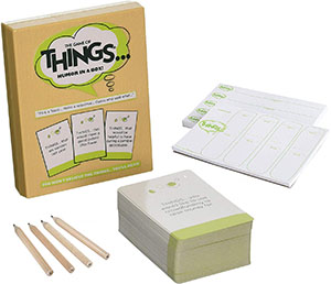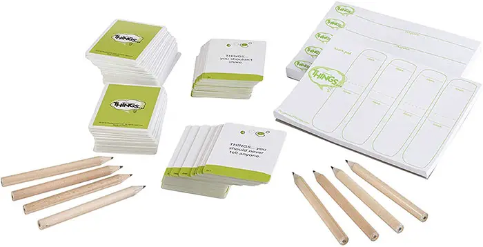 If you can read and write, you can play The Game of THINGS... but parents can take a look through the cards and remove any topics they think the kids might not understand. They are still going to make you laugh.