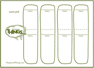 Someone keeps score. This player takes the score pad. Every player gets a pencil and one sheet from the response pad.