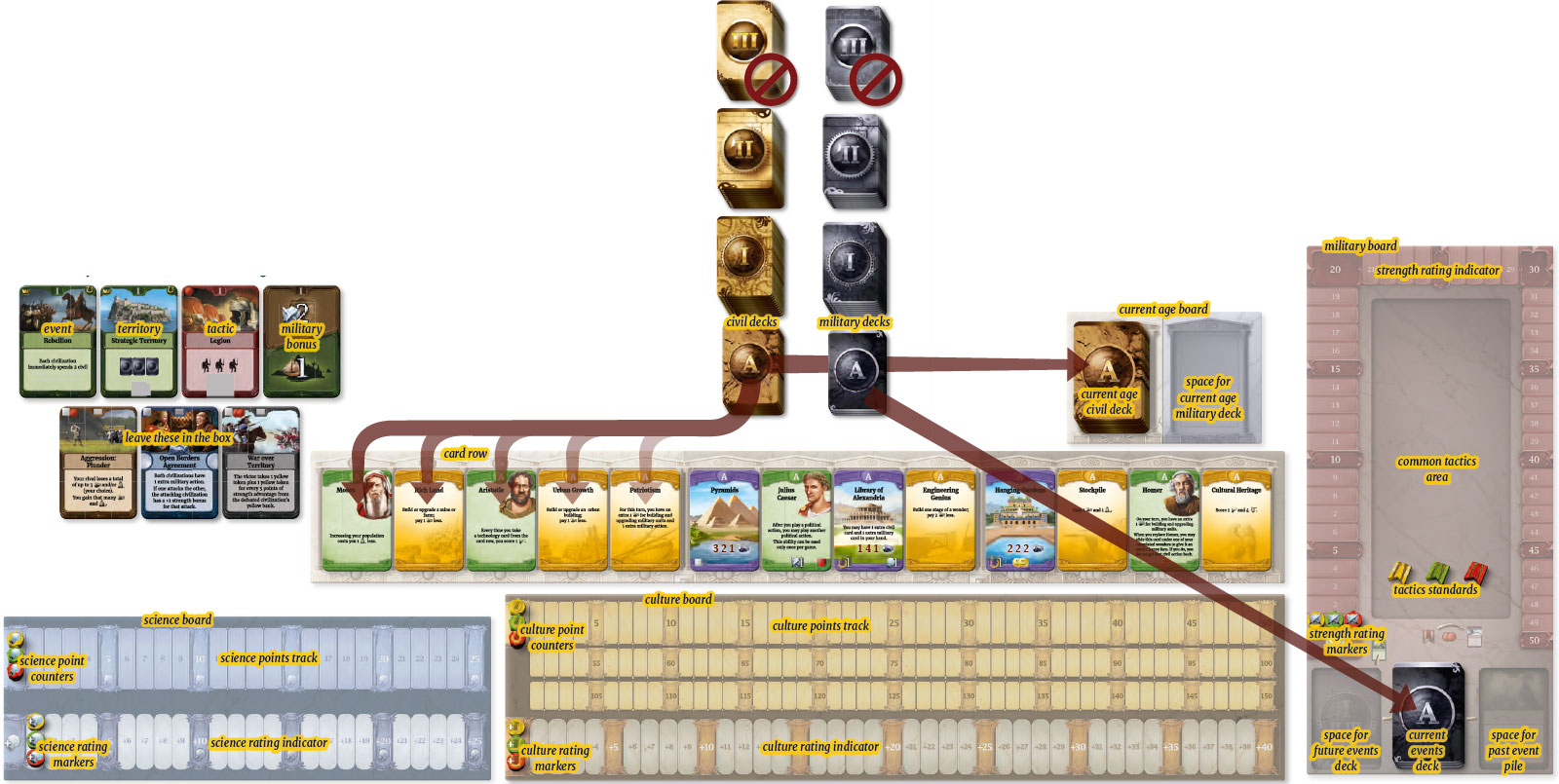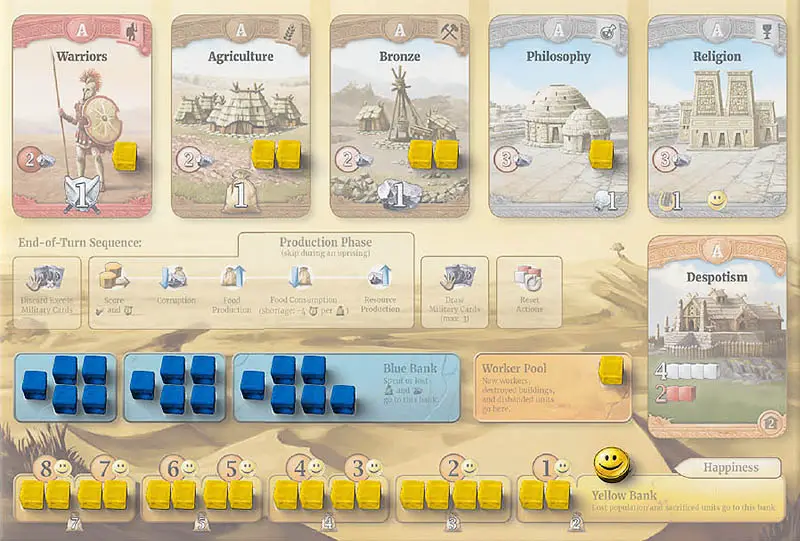 In this game, each player develops a civilization from Antiquity to the present, striving to leave a lasting impression on history. Your civilization scores culture points for its influence on world affairs through literature, drama, religion, wondrous constructions, and great leaders.