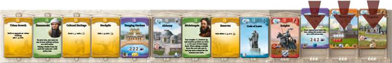 The card row now has several empty spaces, all of them on the right. Deal one card from the current civil deck to each empty space. When you are done, each space of the card row will have one card.