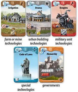 Technology cards come in various colors. Each has a blue number in the upper left corner representing its science cost. You may take any technology card by paying the number of civil actions specified by the card row. There is one minor limitation: