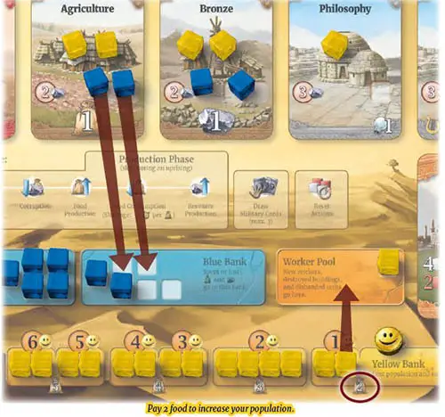 When you gain food, move blue tokens from your blue bank to your farm technology cards to represent the amount gained. For example, you can gain 2 food by moving 1 token to Irrigation or 2 tokens to Agriculture. You may move blue tokens even onto cards that have no workers.