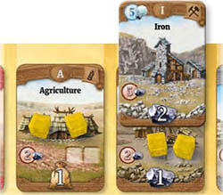 Higher level farm and mine technology cards follow the same rules as those from Age A. The difference is that a blue token on a higher level card is worth more. During the Production Phase, each worker on the card produces only 1 blue token, but the token is worth the value printed at the bottom of the card. For example, 1 blue token on Coal counts as 3 resources.