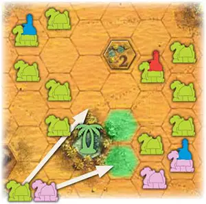 A space that contains a palm tree is an oasis. When you place a camel in a space next to an oasis, the matching caravan is linked to that oasis. Take a 5-point token and place it faceup in front of you.