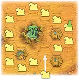 Place Oases: Arbitrarily place the five palm trees, one at a time, on any spaces on the board that show a large pool of water (limit one palm tree per space). Palm trees mark these spaces as oases.