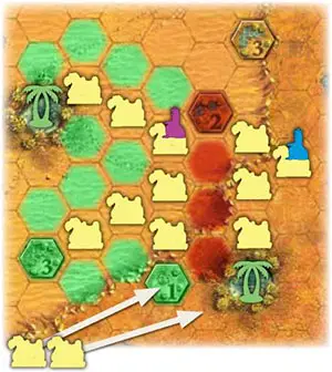 In this instance, there are no oases, so he simply takes the two waterhole tokens in the enclosed area. At the end of the game, he will receive 16 points from the spaces in this enclosed area.