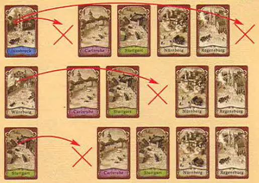 Example: a player has a route that includes Carlsruhe, Stuttgart, Nurnberg, and Regensburg. The player wants to add Innsbruck. As Innsbruck is not directly adjacent to either Carlsruhe or Regensburg on the game board, the player may not add it to either end.
