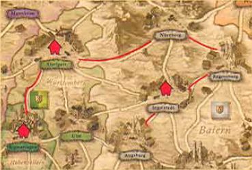 Example: the player closes the following route: Sigmaringen, Stuttgart, Nurnberg, Regensburg, Ingolstadt, and Augsburg.