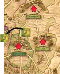 He places 1 house in 1 city in each province of the route (as shown on the right): in Hohenzollern he places 1 house on Sigmaringen, in Wurttemberg he places 1 house on Stuttgart and, in Baiern he places 1 house on one of the 4 Baiern cities, in this case Ingolstadt.