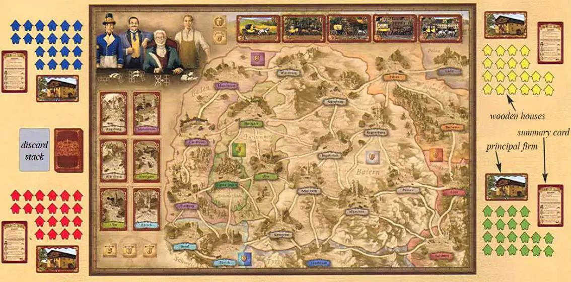 Each player takes the 20 houses of one color, a summary card, and a principal firm card, placing them before him on the table (his play area).