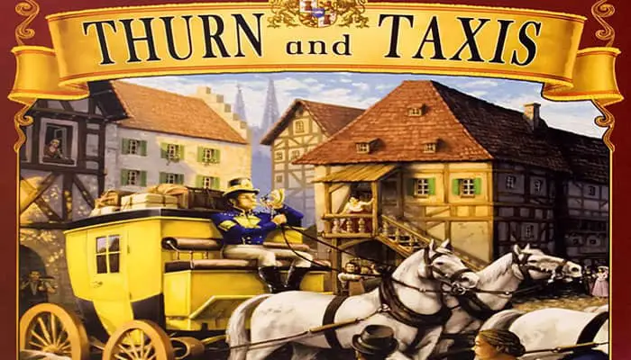 In Thurn & Taxis, players build post office routes across Bavaria and the regions around, collecting bonus points in various ways. The board shows a map of all the cities, with roads leading from each one to some of its neighbors. There are various colored regions around the board, most with two or three cities, and a large region with all the Bavarian cities in the center.
