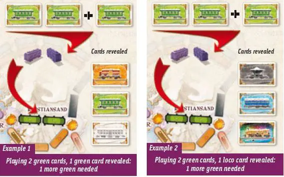 For each card revealed whose color matches the color used to claim the Tunnel (including locomotives), an additional card of the same color (or a locomotive) must be played to successfully claim the Tunnel. See Examples 1 and 2.