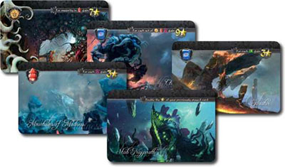 There are 18 cards in total: 3 for each of the 5 suits, plus 3 without a suit. 8 cards also feature Madness. Most cards provide a scoring condition that will reward you with VP if you meet the condition.