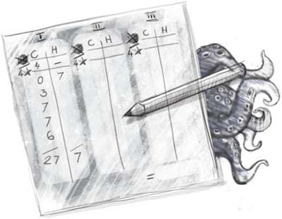 , or heal 1 Madness by discarding a token. In case of a tie, no player gets to choose. - Now, check each of your cards for their scoring objectives and write down your points on the notepad.