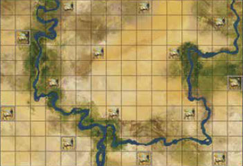 The advanced game board is an alternate board printed on the back of the original board. It is differentiated by a blue border (rather than gold). It uses a different map and contains four extra treasures. When you play with the alternate board, place one temple with a treasure on each of the fourteen Shedu spaces. Then, play by the original rules.