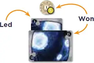 Create a stack with the led card (on bottom) and the winning card (on top), oriented so that the suits and values of both cards remain visible, and place it below the event token. If the led card is the winning card, place it by itself. Discard all other played cards.
