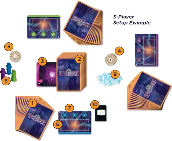 7 Each player takes a set of three control discs in the color of their choice and places them in the three slots on their time machine card.